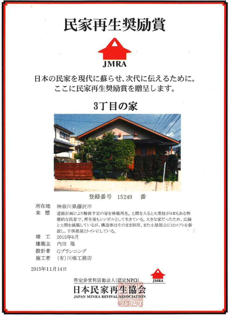 藤沢市に所在する空き家を移築再生。土間を入ると大黒柱と太鼓梁、差し鴨居がある構造体を見せ、民家を象徴するシンボルとして造り上げました。
